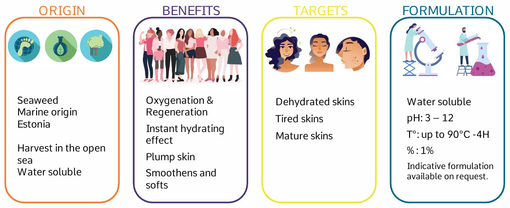 Polysaccharides are extracted by hot water then depolymerized via a proprietary HTAC step to yield a water‑soluble active fraction optimized for topical penetration and bioavailability.